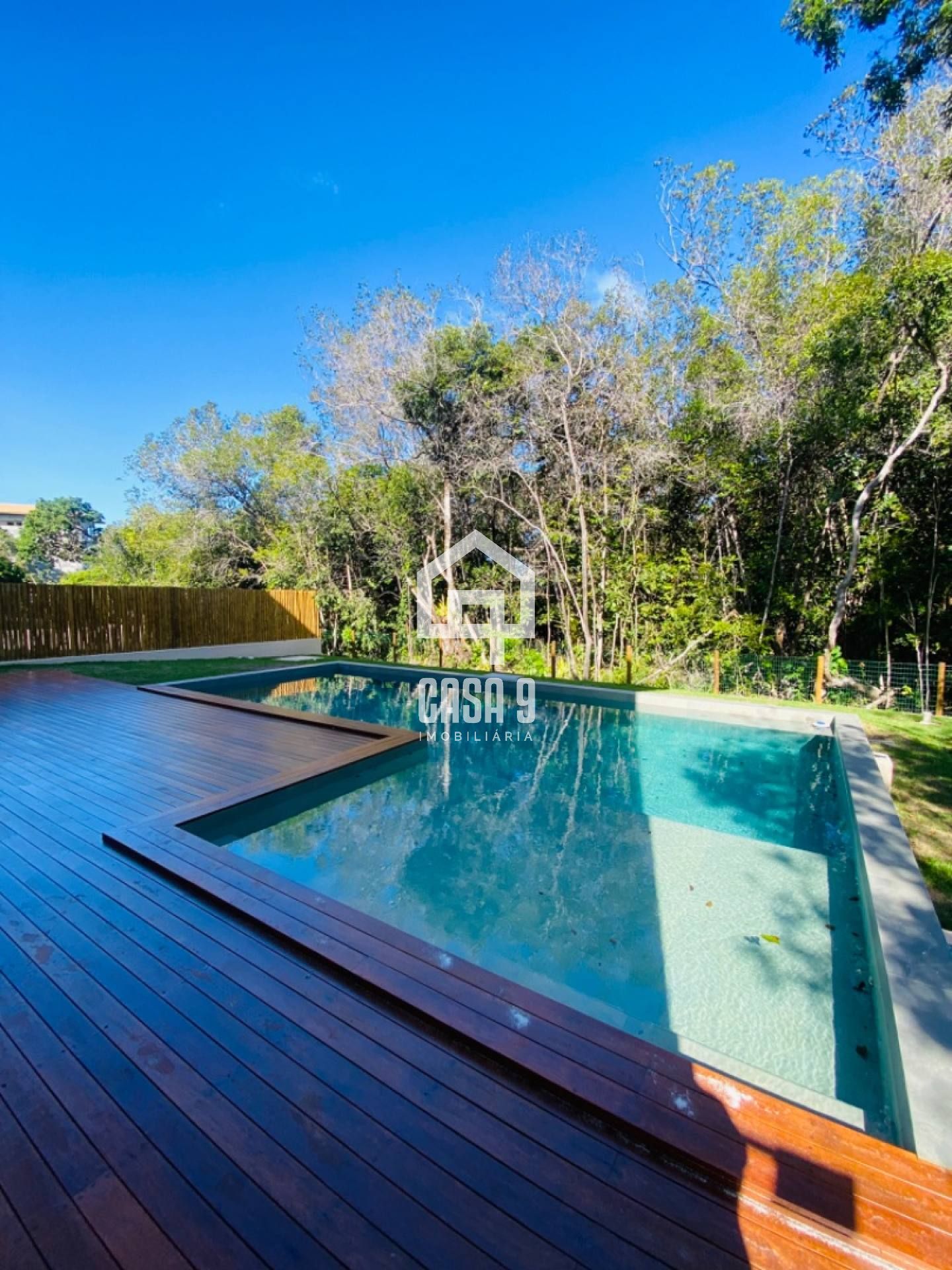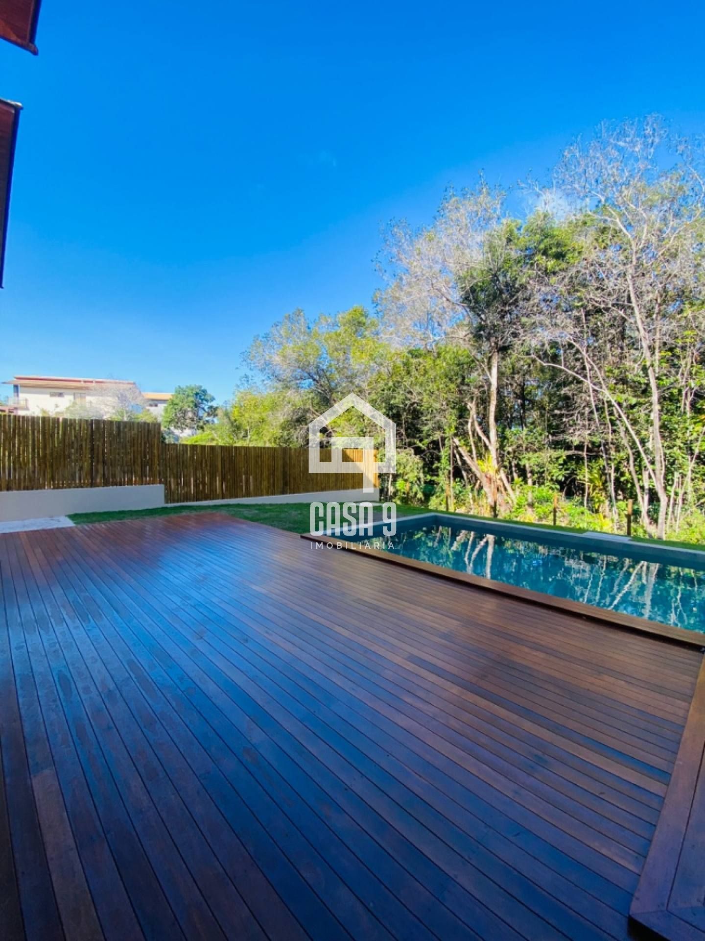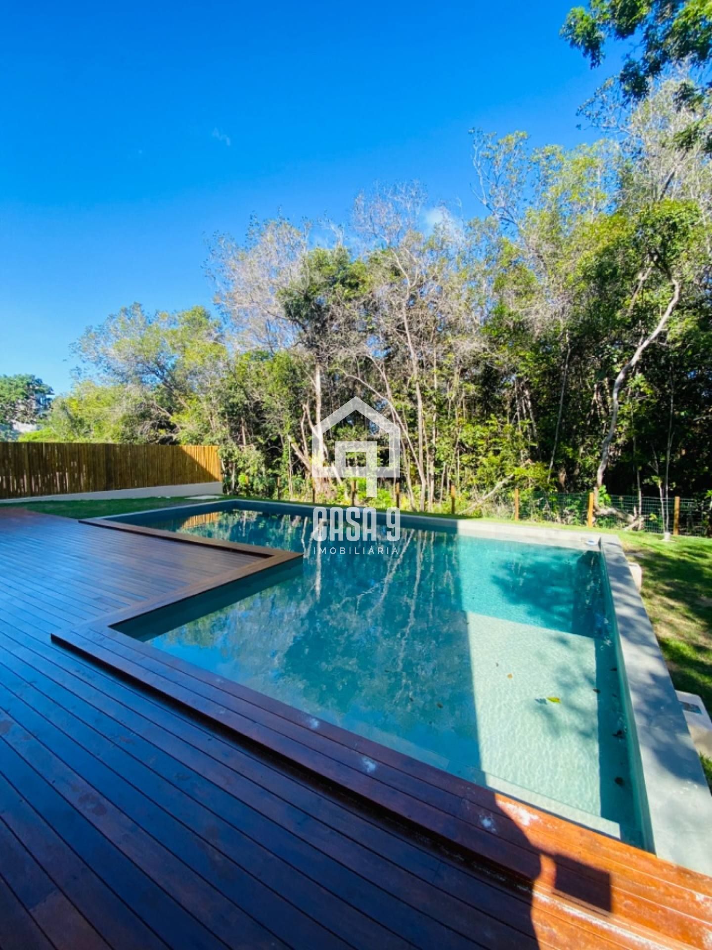 Piscina com prainha e deck em madeira de lei