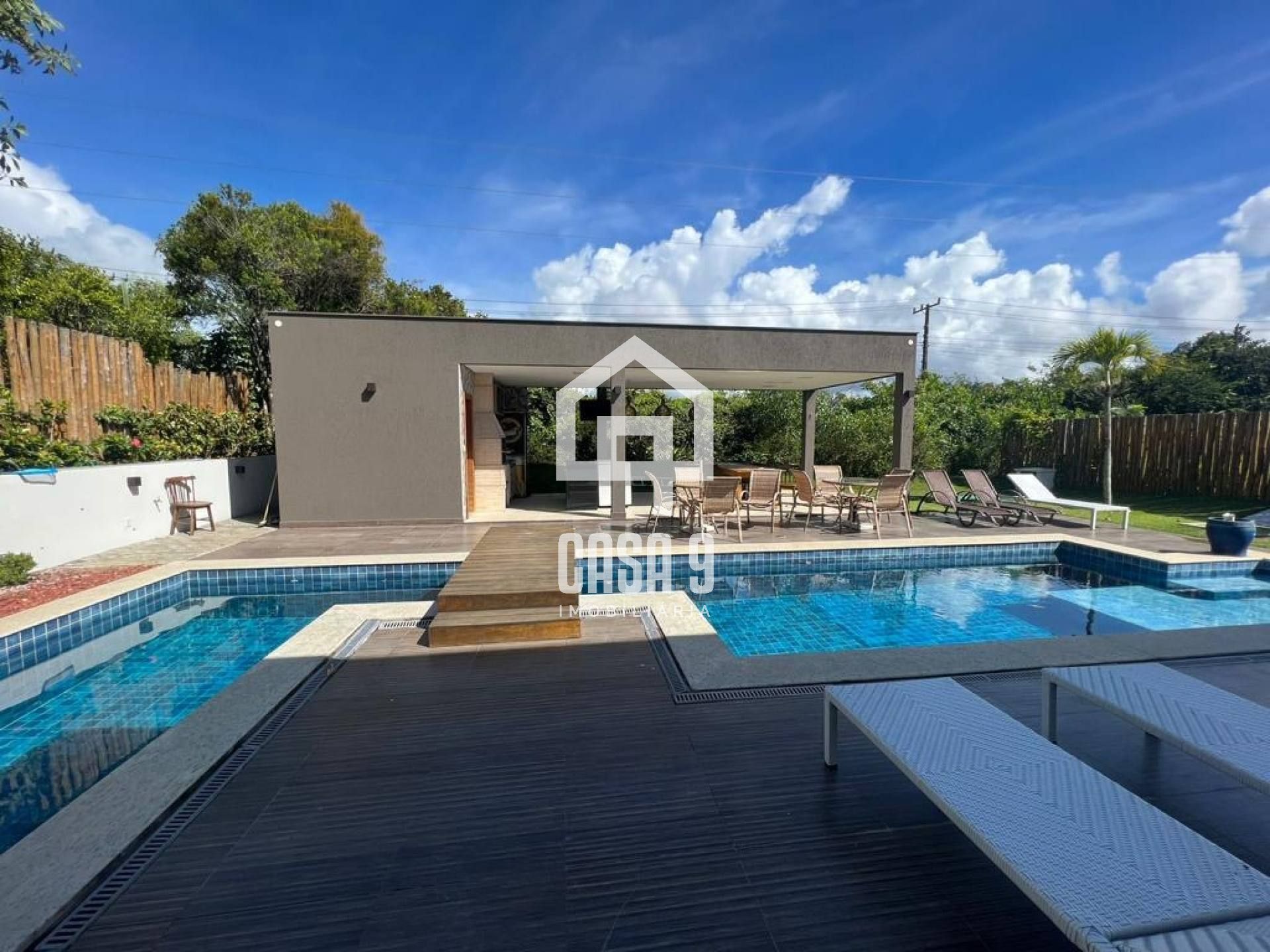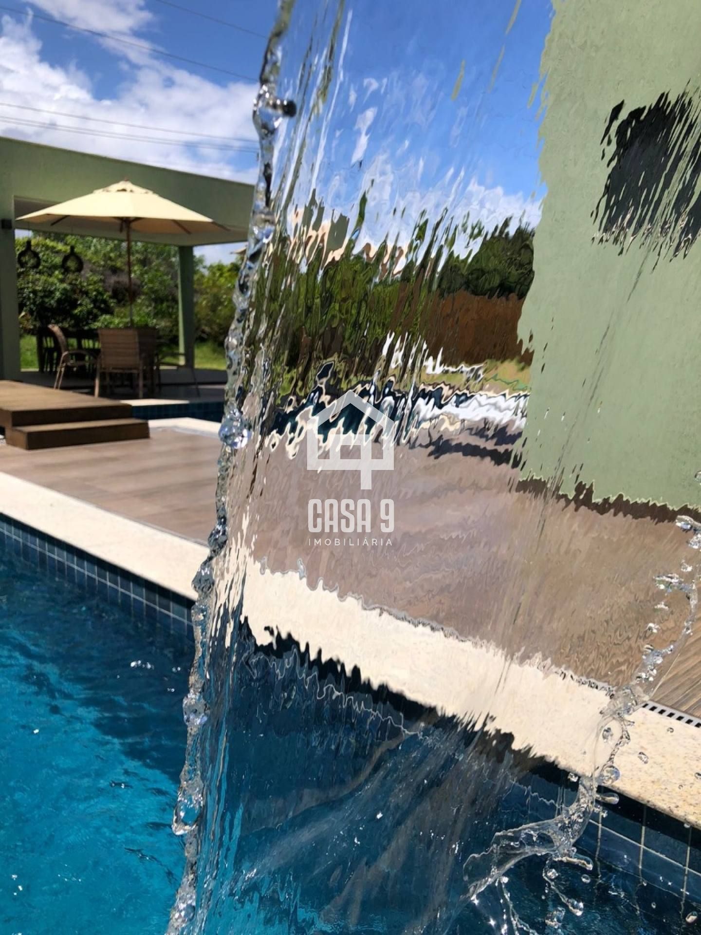 A piscina com hidro e cascata é o ponto central da casa, integrada ao espaço gourmet e ao deck — perfeita para lazer e relaxamento.