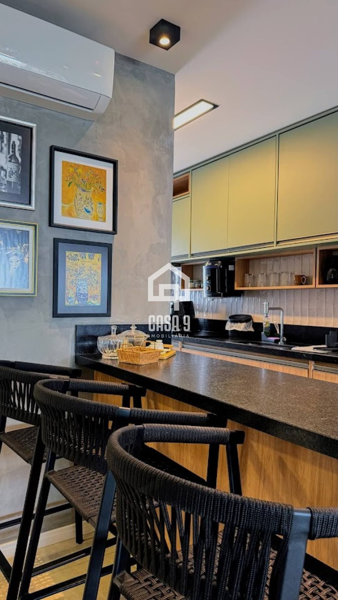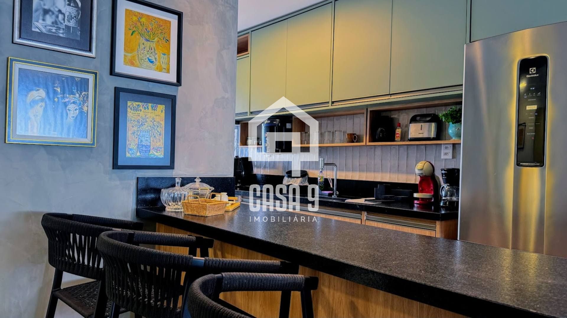 – Sala de estar integrada à cozinha equipada, criando um ambiente acolhedor e funcional