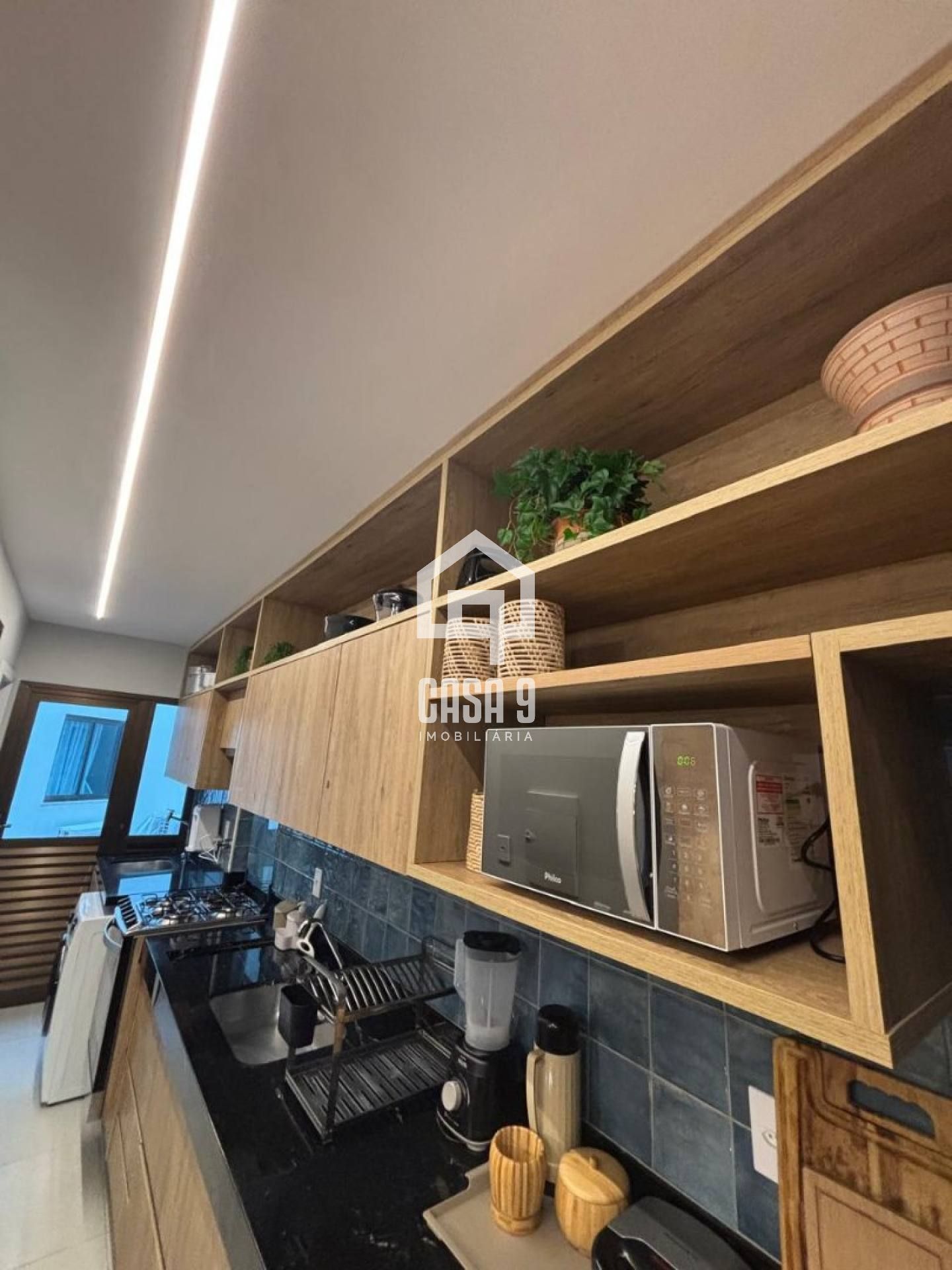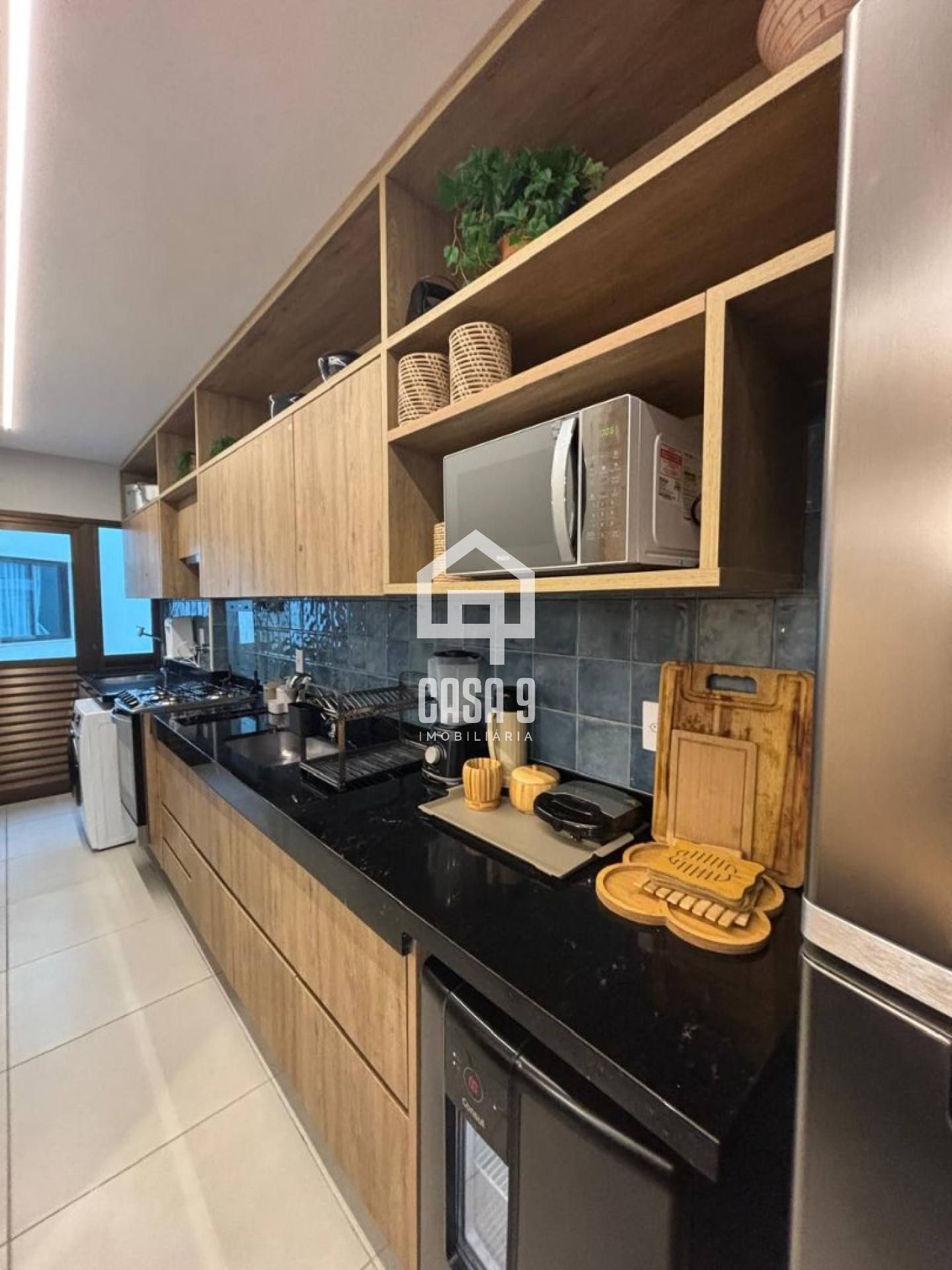 – Sala de estar integrada à cozinha equipada, criando um ambiente acolhedor e funcional